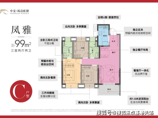 建面约 99㎡三房两厅两卫:刚改优选,南北通透,主卧套房配独立卫浴与衣帽间。4.5 米面宽横厅,客卫干湿分离,三间卧室分布合理,兼顾私密与舒适。