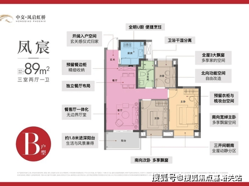 建面约 89㎡三房两厅一卫:爆款刚需户型,三开间朝南,南向面宽 9.5 米,LDK 一体化设计,空间零浪费。主卧带飘窗,双卧朝南,全明通透,适配三口之家。