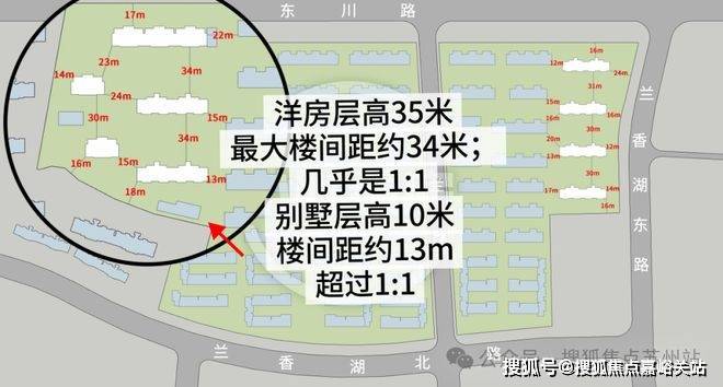 10米高的别墅,楼间距做到了13m左右!墅境洋房35米的层高,最大的楼间距做到了34m!