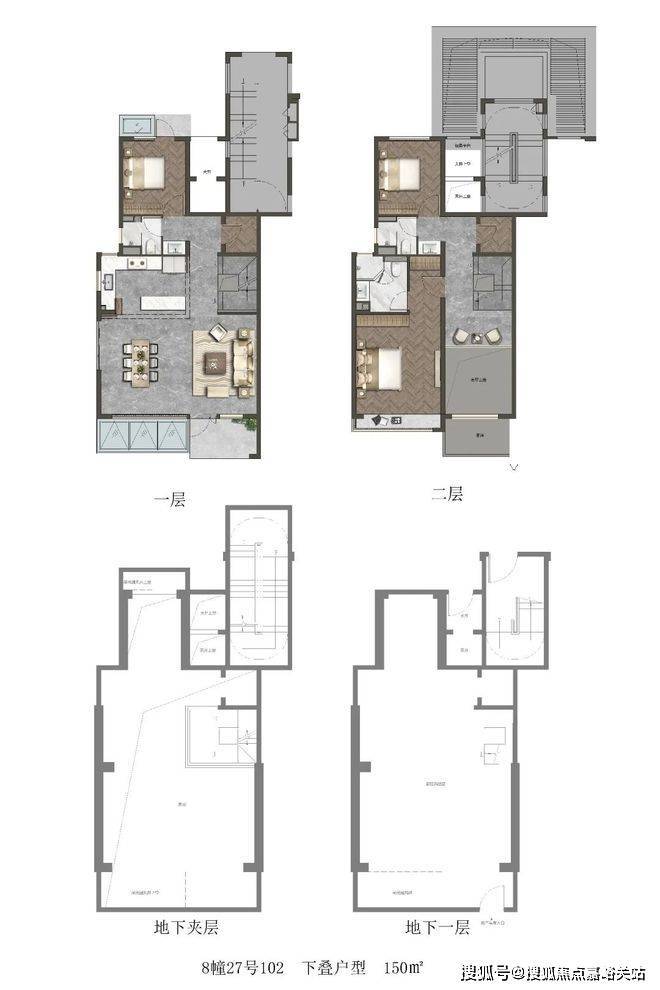 以建面约150㎡下叠户型为例:首层拥有约7.2米的横厅,与南向花园相连;二层的部分区域设计为客厅挑空,让客厅更气派,可以改造为房间增加功能性;地下室层高约5.65米,根据业主喜好设计为酒窖、健身房、SPA室,书房等。