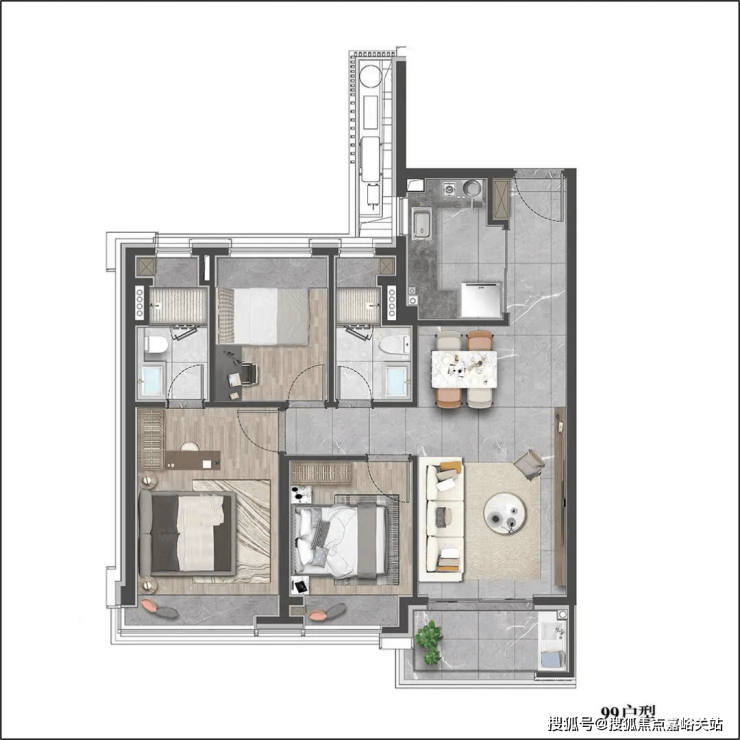 建面约99㎡的三房设计,在空间上使用功能更加多样化,一站式解决了家庭生活的所有功能,优化居家动线,大大提升空间的居住体验。