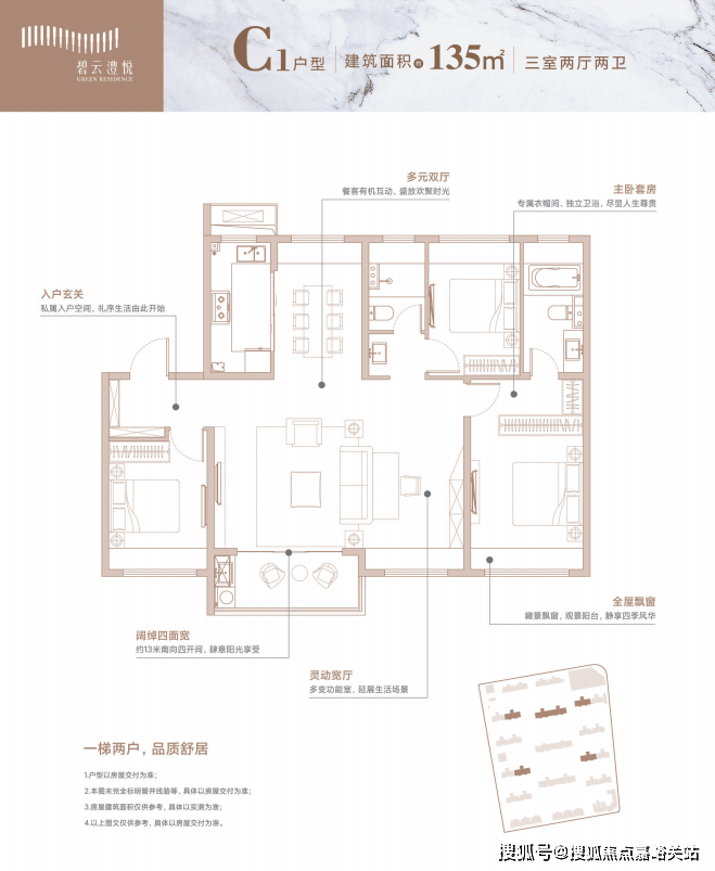 建面约135㎡3房2厅2卫: 四开间朝南,大横厅设计,搭配宽景阳台,主卧南北通套房,带步入式衣帽间和独立卫浴。
