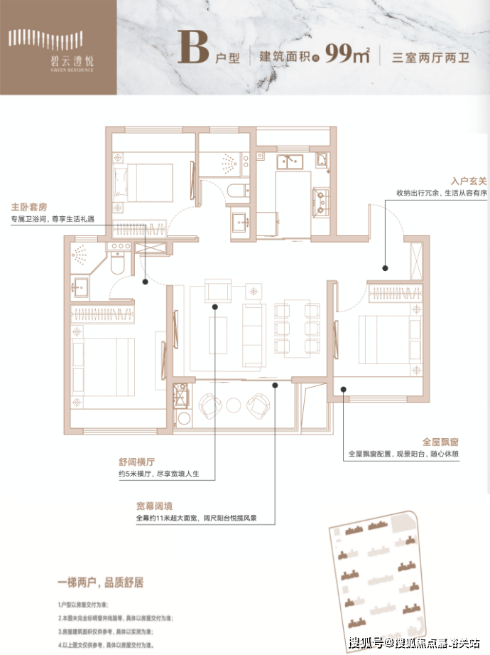 建面约99㎡3房2厅2卫: 入户玄关设计,增加归家仪式感;次卫三段式分离设计,干湿分离,避免使用冲突。