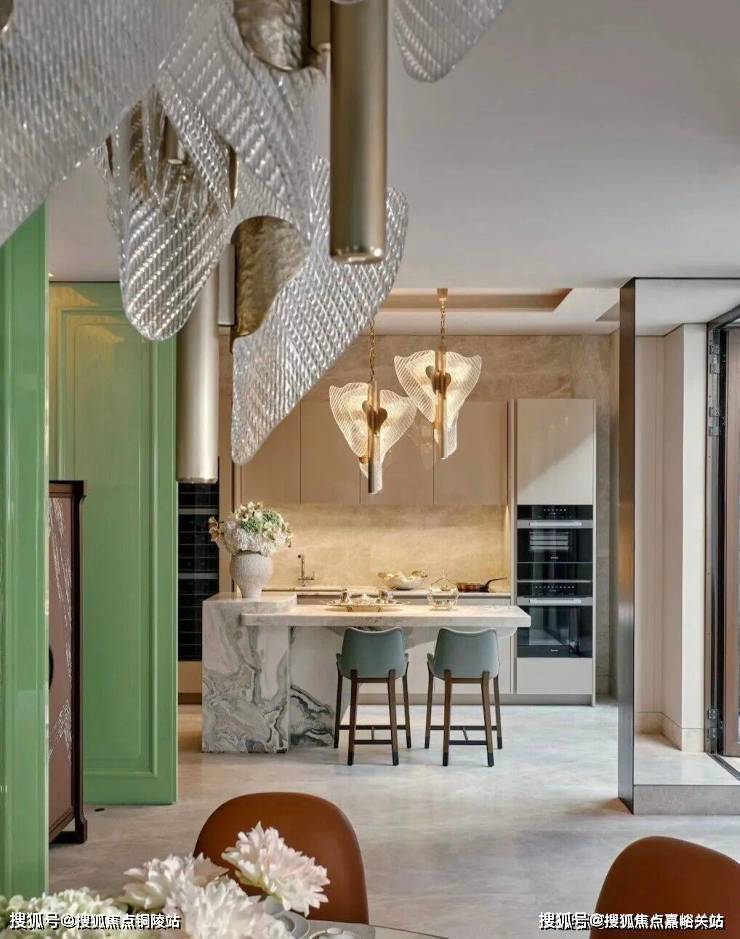 餐厅的设计巧妙融合了老上海的经典元素,圆形餐桌和橘色皮质餐椅在色彩上既现代又充满活力,顶部的水晶吊灯造型灵感来自上海市花“玉兰花”,既增添了空间的华丽感,又巧妙地融入了上海的地域特色。