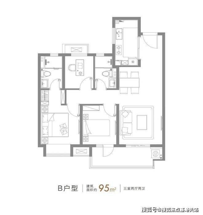 光明星城售楼处电话:400 - 856 - 9058建面约95㎡的3房2厅2卫户型,可以说是刚需置业一步到位的户型,从二人世界到二胎家庭的全生命周期需求都能满足。