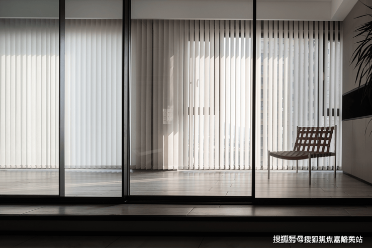 垂直百叶窗将透过大落地窗照进家中的光线均匀切开,营造出光影的效果,既保证了充足的光线又有效保证了隐私性。