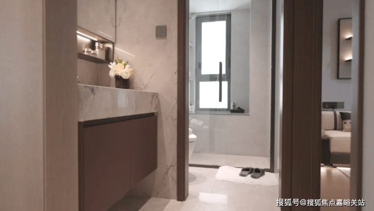 地面、墙面都采用匹配色系的石材,美观而又便于日常清洁;包括在门框处,地面用石材垫高了几公分,有效防止返潮……最后我来到阔绰的主卧,皮质背景墙+阔景飘窗,在柔和的灯光映衬下,质感的生活仿佛就在眼前。