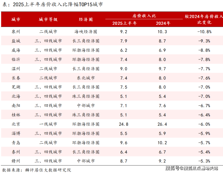 报告显示,2025上半年一线城市房价收入比为25.4,较2024年下降2.7%;二线城市房价收入比为10.5,较2024年下降2.8%;三四线城市房价收入比为7.4,较2023年下降3.0%。
