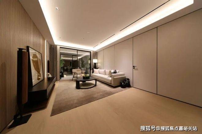 项目室内采用极简审美设计,从背景墙开始一路延展,无边框隐形门,以及简化的金属踢脚线,让立面保持完整如一,视觉效果简洁大气,同时提升了空间的通透感与整体感。