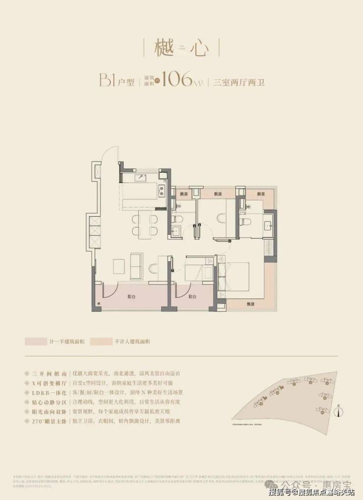 经典动静分离户型,预留分户“S”墙设计,三开间朝南+双阳台,阳台合仅计算一半建筑面积,主卧以及主卫附赠270°转角飘窗;