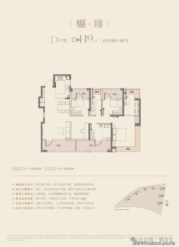 经典动静分离户型,4.5开间朝南+南北四阳台,阳合仅计算一半建筑面积,主卧以及主卫附赠270°转角飘窗;