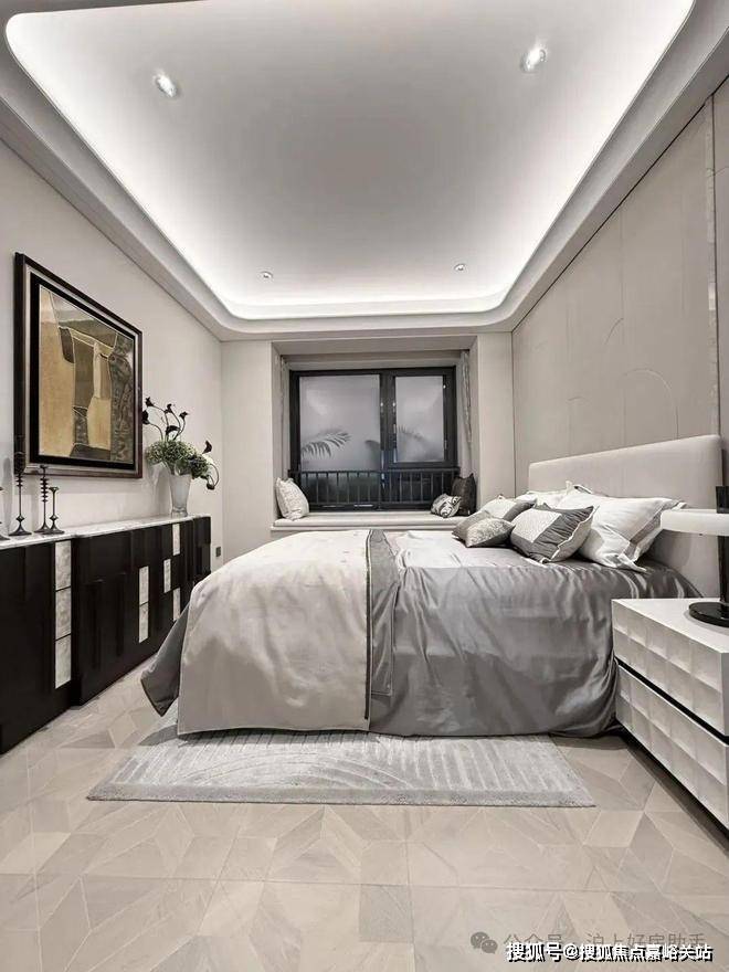 海上清和玺售楼处电话:400-856-9058☑️☑️电视背景墙采用卡慕白的石材+皮革造型,弧形吊顶,相当讲究,连空调出风口的形状都打造为海上·清和玺logo山茶花的形状~~三大件为大金(或同等档次)中央空调和地暖,新风系统为百朗(或同等档次),南向阔景阳台,采光视野一级棒!海上清和玺售楼处电话:400-856-9058☑️☑️