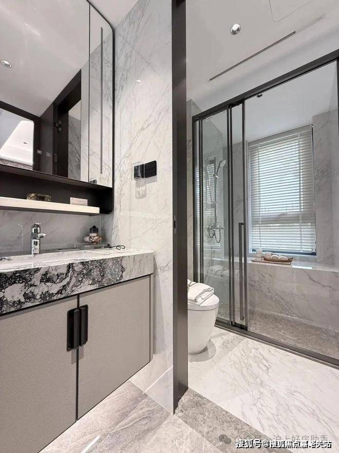 海上清和玺售楼处电话:400-856-9058☑️☑️奢石台面,皮革饰面柜抽屉,侧端设置金属收纳开放格;定制镜柜,中间的透光玉石直接提升了高级感,镜柜内部配备了美妆冰箱+美妆灯条+轨道收纳!海上清和玺售楼处电话:400-856-9058☑️☑️