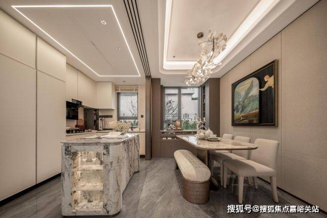 厨房与餐厅通过岛台相连,不仅实现了空间的流畅过渡,更彰显了豪宅的非凡尺度。