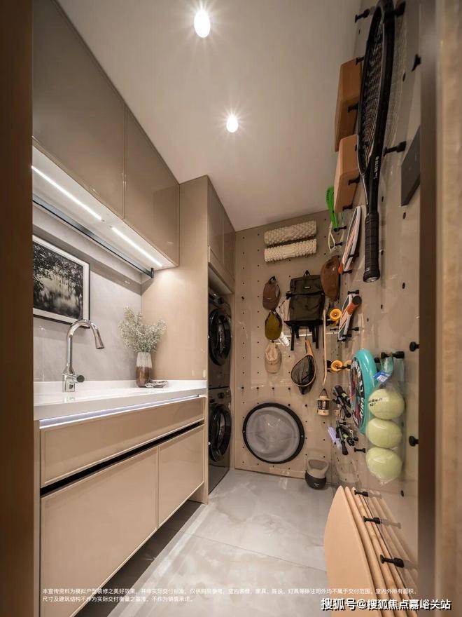 以前的房子,阳台永远晾满了衣服,你想种的花只能挤在角落。现在好了,入户玄关背后藏着独立的家政空间——洗衣机烘干机叠放,上面是定制收纳柜,放洗衣液、柔顺剂、衣架和各种清洁工具。洗完直接烘干,衣物收进柜子,整个阳台彻底解放。