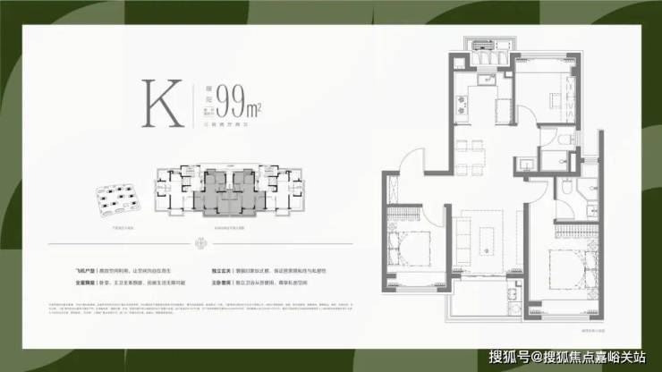 实现了大面宽横厅的飞机户型设计,使得南向的开间,全部布置为客厅、主卧和次卧三个最重要的功能区;北向房间则布置了次要的厨房、次卫、书房和主卫功能,最优化的提供南向面宽和缩窄户型整体进深,提升户型整体的采光和通风。