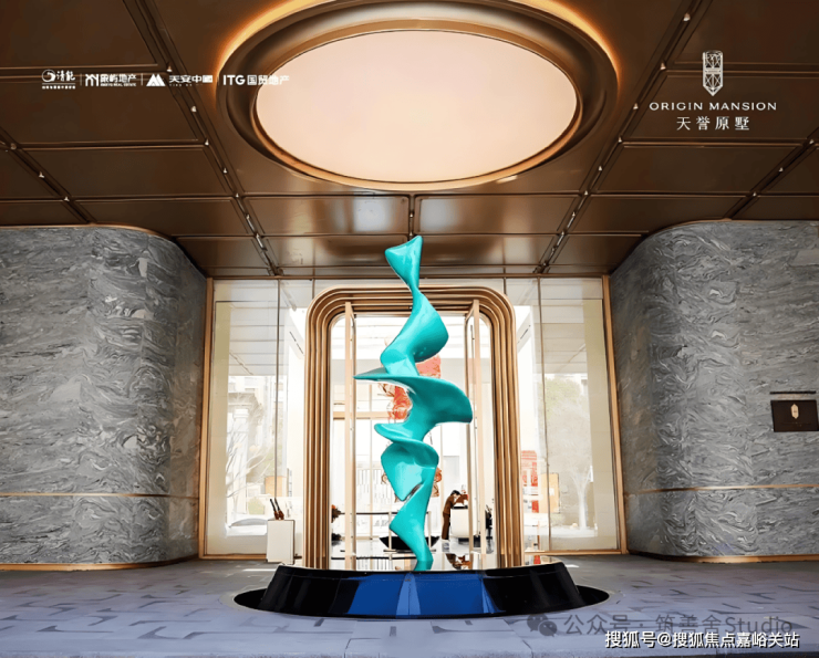 天誉原墅在社区入口的设计上,展现了极高的审美与气度。项目打造了长达约54米的恢弘门厅,搭配约6.5米的挑高门廊,以“立体、奢阔、无界”的格局,构筑起磅礴大气的第一视觉印象。两侧臻选金米黄石材与库班绿石材拼接,肌理细腻、质感厚重,搭配利落的金属线条勾勒轮廓,没有多余装饰,却在细节处尽显国企精工底蕴。入口处艺术水景与名贵乔木掩映,潺潺流水与温润石材相映成趣,藏风聚气,消解城市喧嚣,营造出“一步一礼序,一景一尊崇”的归家意境。