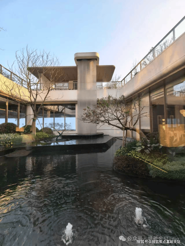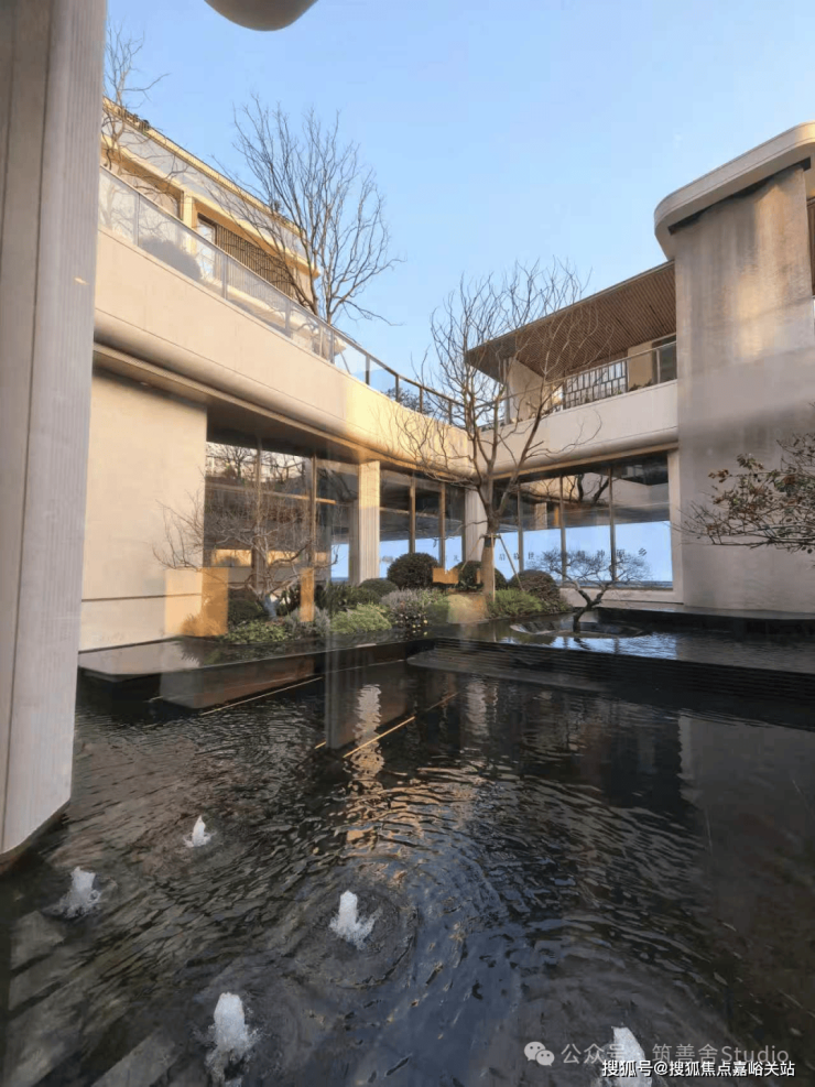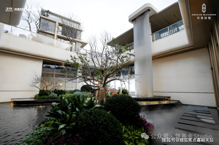 项目打造了一座充满意境的下沉式庭院,这里被设计为社区的“呼吸之所”。庭院中最引人注目的,莫过于那一处约10米落差的金属挂帘流水瀑布。水流如丝如缕,沿金属幕帘倾泻而下,与地面的静水景无缝衔接,水声潺潺,让每一次归家都成为一场意境漫游。庭院中央,一棵姿态优美的羽毛枫傲然挺立,其绚烂的色彩为静谧的空间注入生机。树池采用黑金沙花岗岩异形精工打造,细节之处尽显匠心。这里不仅是风景,更是未来业主冥想、会友的绝佳背景。