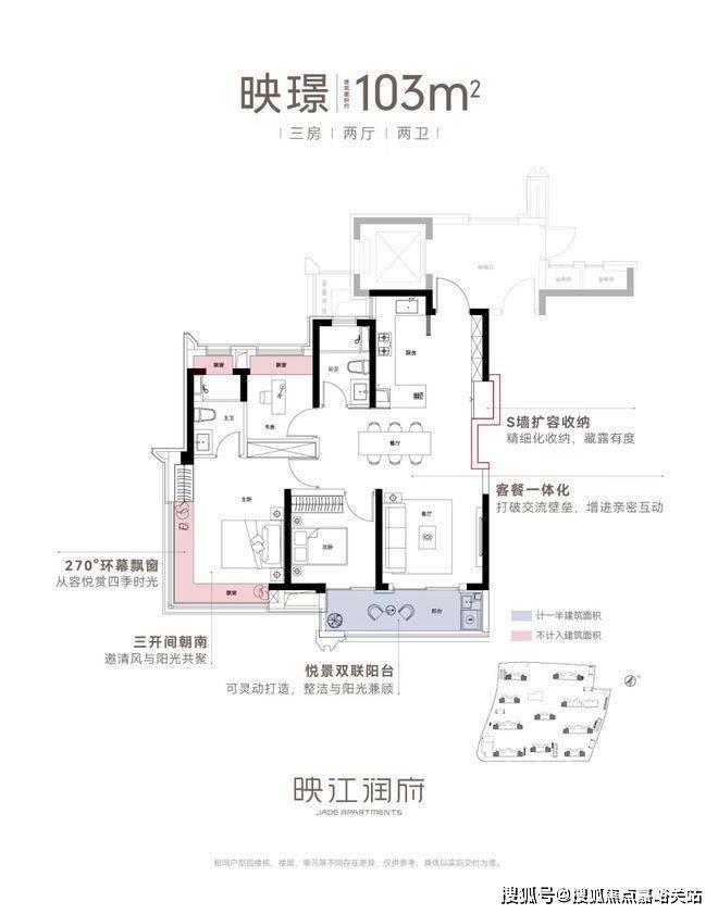 华润映江润府售楼处电话:400-856-9058亮点五 :双联阳台+多飘窗赠送、灵动空间。映江润府103户型,实现了100平级别难得的双联阳台,实现了室内空间的横向延伸,同时,搭配主卧、主卫、书房的“全飘窗”设计,赋予了空间更多灵动的使用场景。华润映江润府售楼处电话:400-856-9058