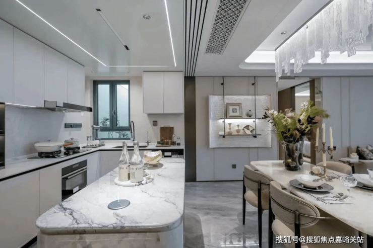前所未及的超大尺度,结合曲面的艺术设计,使得整个室内的居住品质得到了质的飞跃!功能区的设计也充满了人本的细节设计和思考,阔朗的超大厨房设计,定制岛台,升降式插座,实现大家族式的社交式烹饪。