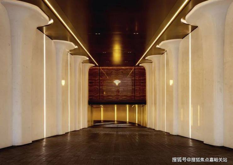 6、社区含“奢材”量很高。门庭延街的外立面,以精工定制弧形米色石材为主调,镶嵌典藏级老虎玉大理石,点缀古铜色现代海派艺术感灯器,整体呈现出百年海派的贵雅气质。