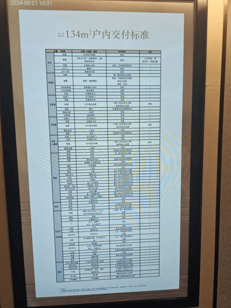 装标,大金的中央空调和地暖,白朗新风。厨房标配博士的三眼灶、油烟机、洗碗机和冰箱,134加配蒸烤一体机;卫生间高仪的洁具和花洒、科勒的龙头。