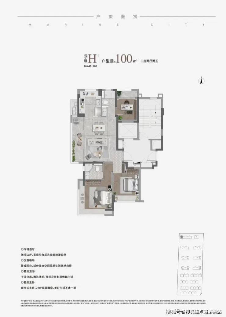 部分建面约100-101㎡H边厅户型,全景阳台搭配主卧L型转角大飘窗,三面采光+270°环幕视野,景观面堪比市区滨江顶豪,白天远眺松江人文,晚上看脚下星火流淌,十分惬意。