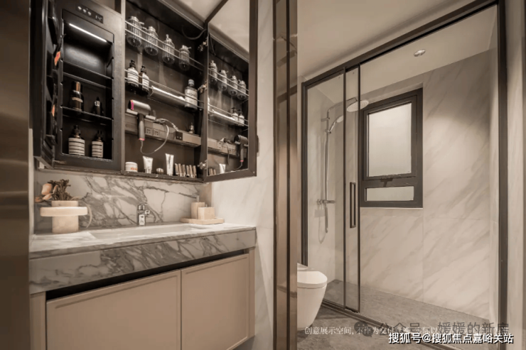 尤其是卫生间的镜柜,使用了内外双镜 ✅✅ 招商时代潮派售楼处电话:400-9975-759✅✅ ,并且内部的收纳空间相当丰富,小到女主人的发箍、面膜、口红、香水,大到吹风机都有适合的位置。