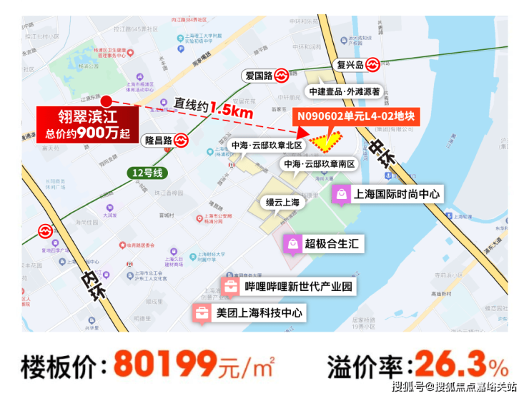 杨浦区N090602单元L4-02地块,5家经过了72轮的报价,最终以溢价率约26.30%、楼面价约80199.3元/㎡的成绩被拍下。