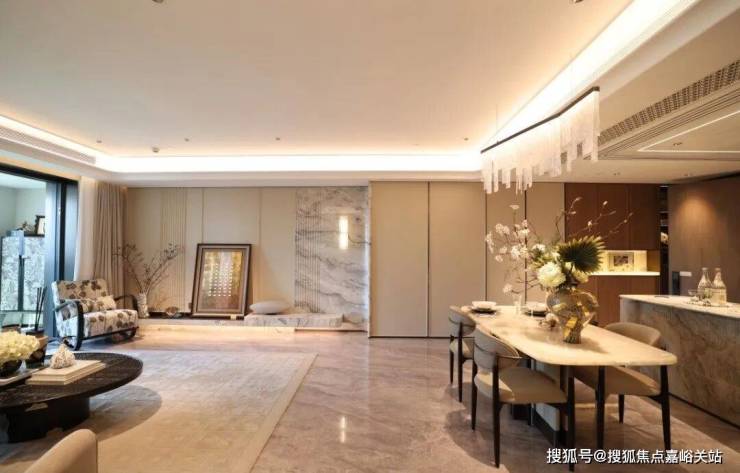 来到建面约112㎡3房2厅2卫样板房,设计主打海派风格,开放式厨房和西餐岛台,卫生间地面拼花,石材台面镀金龙头。标准的三开间户型,设计上将传统的过道改为餐厅空间,将公共区域做大了。