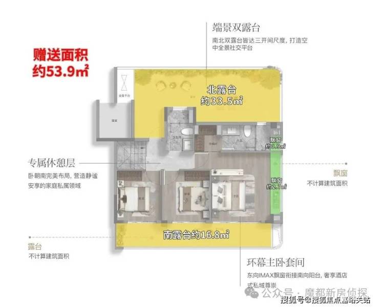 除了 约9.8米的跑道阳台4+1室的格局约270°的IMAX超级采光面 外,这个户型拥有两个最独特的优势: