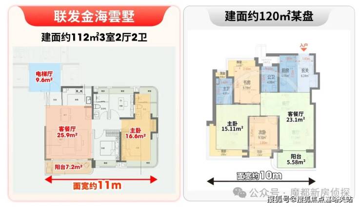 说实话,竞品的建面约120㎡也同样非常出众。但即使如此,金海雲墅建面约112㎡的产品依旧在附赠、客厅、主卧、独立电梯厅等维度碾压了他。