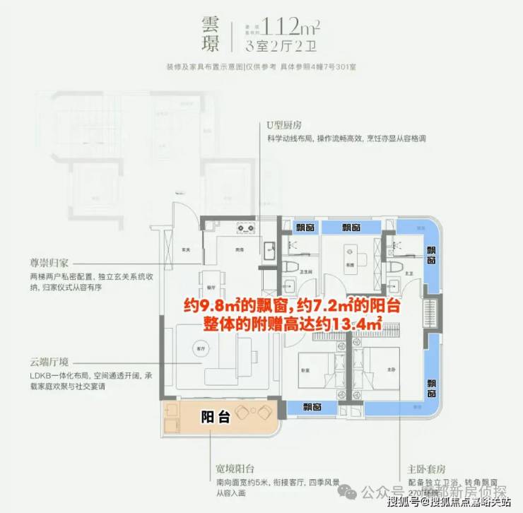 第一,这个户型有约9.8㎡的飘窗,约7.2㎡的阳台,整体的附赠高达约13.4㎡。 这是目前上海外环沿线,是附赠率最高的一个小高层产品。