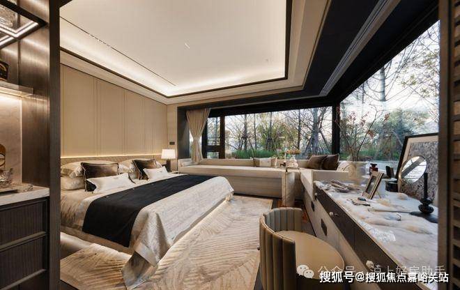 其中主卧的270°转角飘窗就有约5.7m²,通过与外立面的结合,直接做了梳妆台和储物柜,拓展了飘窗的实用性。