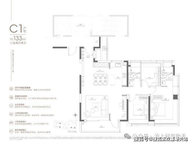 133㎡可以说是108㎡的进阶款,同样的三房两厅两卫,大面宽横厅、半开放式厨房设置岛台,加上主卧L型飘窗,再一次验证了华润置地豪宅化的产品思路。