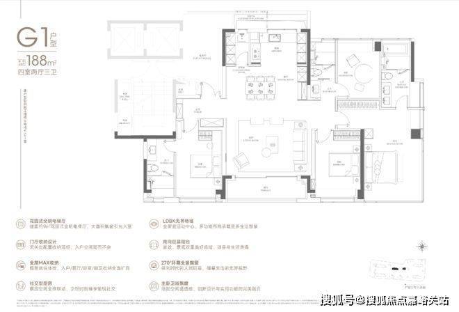 188户型2梯2户,有独立的电梯厅。4房3卫设计,还是3明卫,这两点还是不错的。