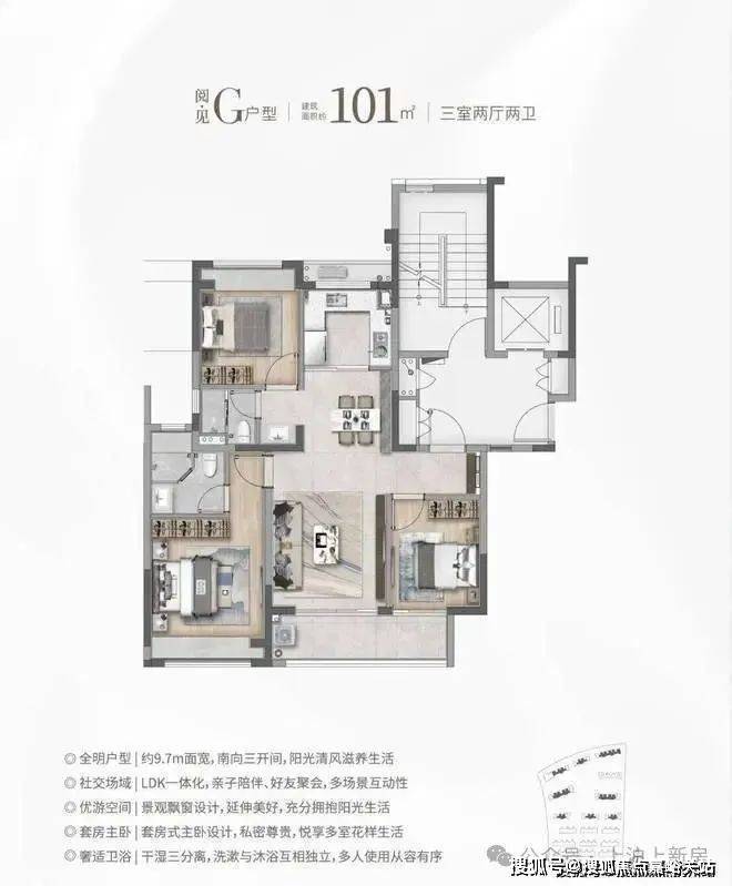 售楼中心电话:4008569058(温馨提示:本项目参观样板间采取预约制,为了不耽误您的行程,过来参观请提前来电进行预约看房或咨询项目详情)②建面约101㎡G户型:尺度更阔绰的进阶品质之选!几乎延续了上一个户型所有的优点。但是在尺度感上更进一步,南向面宽做到了惊人的约9.7米,让业主起居更加从容。南向观景阳台进一步拉大,贯穿客厅和次卧,形成了一个更为灵动实用的多功能空间。细节处理更到位,次卫做了干湿三分离设计,利用率更一步提升!华发海上都荟