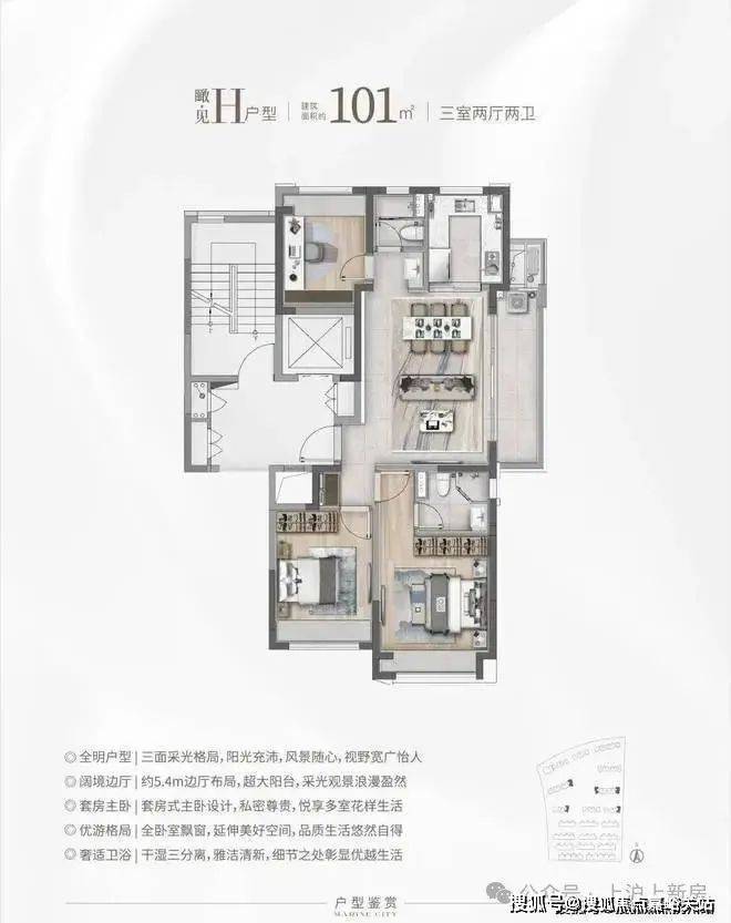 售楼中心电话:4008569058(温馨提示:本项目参观样板间采取预约制,为了不耽误您的行程,过来参观请提前来电进行预约看房或咨询项目详情)③建面约101㎡H户型:三面采光,全能景观王炸边厅户型!同样是3房2卫的配置,功能性与舒适度兼具。该户型惊艳的地方在于大尺度的景观边厅设计,搭配超大阳台,营造IMAX级别的客厅景观面,极具阔绰感! 全卧室飘窗、干湿三分离、U字型厨房设计,同样的魔鬼细节!华发海上都荟