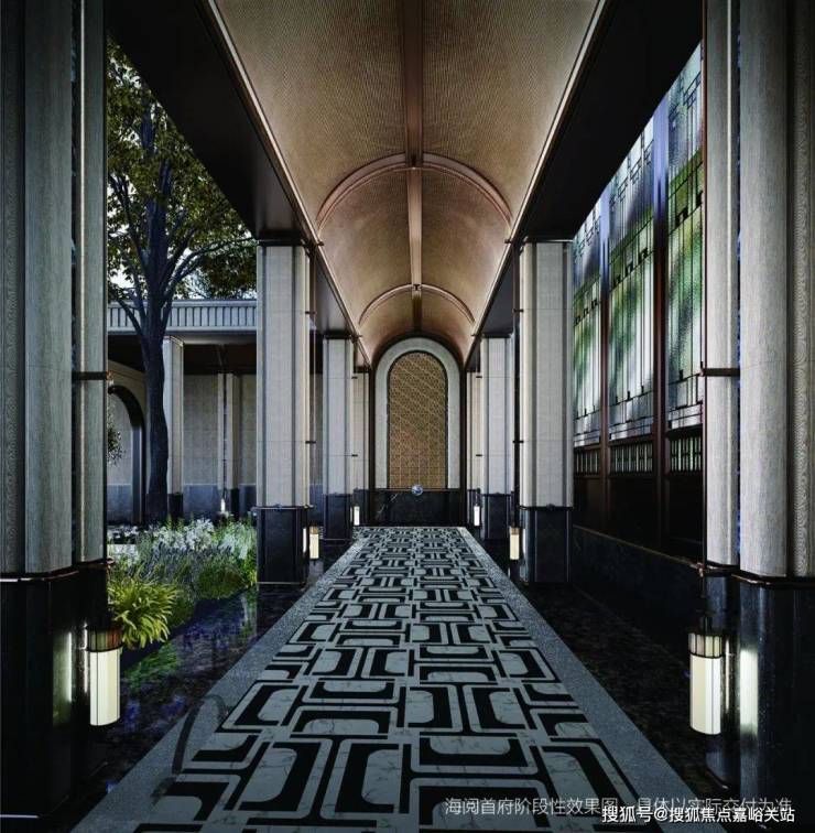 特别是下面这样一个时光长廊,将社区中的风雨连廊经由海派风格重新演绎,拱形的吊顶、石材的立柱、繁花的地面拼花, 让人梦回那老上海的摩登年代。