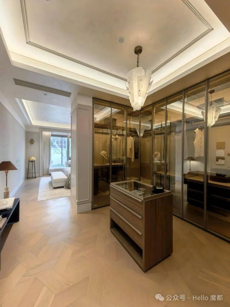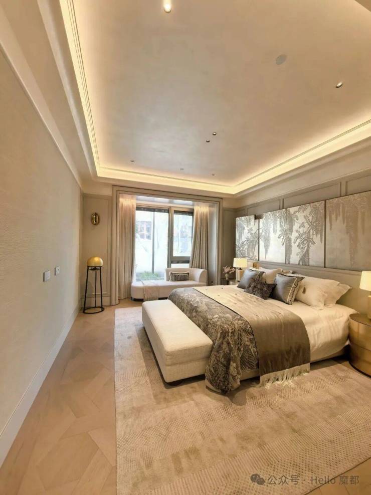 行政级主卧套房:双开门仪式感,超尺度空间,配置独立衣帽间、双台盆卫浴(浴缸+淋浴)、类酒店Mini Bar及私享客厅,休憩、社交、观景功能完备。
