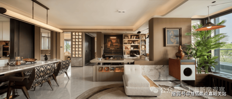 从示范区的打造上来看,保利打造了度假感氛围!采用了国际度假酒店的打造手法,从门头、 具有海蓝色的水景海岛感的花园植物丰富艺术品的植入 ,以及非常亮眼的 上海首个浮雕水景艺术卡座 ,营造轻松、惬意的氛围,像这样的松弛场景在项目中数不胜数,给到客户强烈的度假感和松弛感。