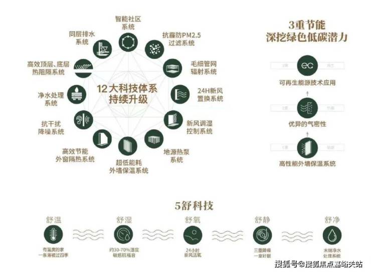 项目深度进阶 12大科技系统、三重节能与五舒科技等技术核心,以 更智慧化、定制化、生活化的品质空间,适配高净值客群追求品质的居住需求。