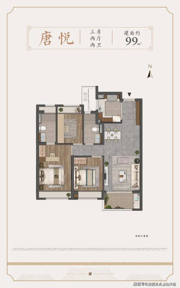 约99㎡3房2卫,汇聚了市面上优秀户型应该有的大多数特质。