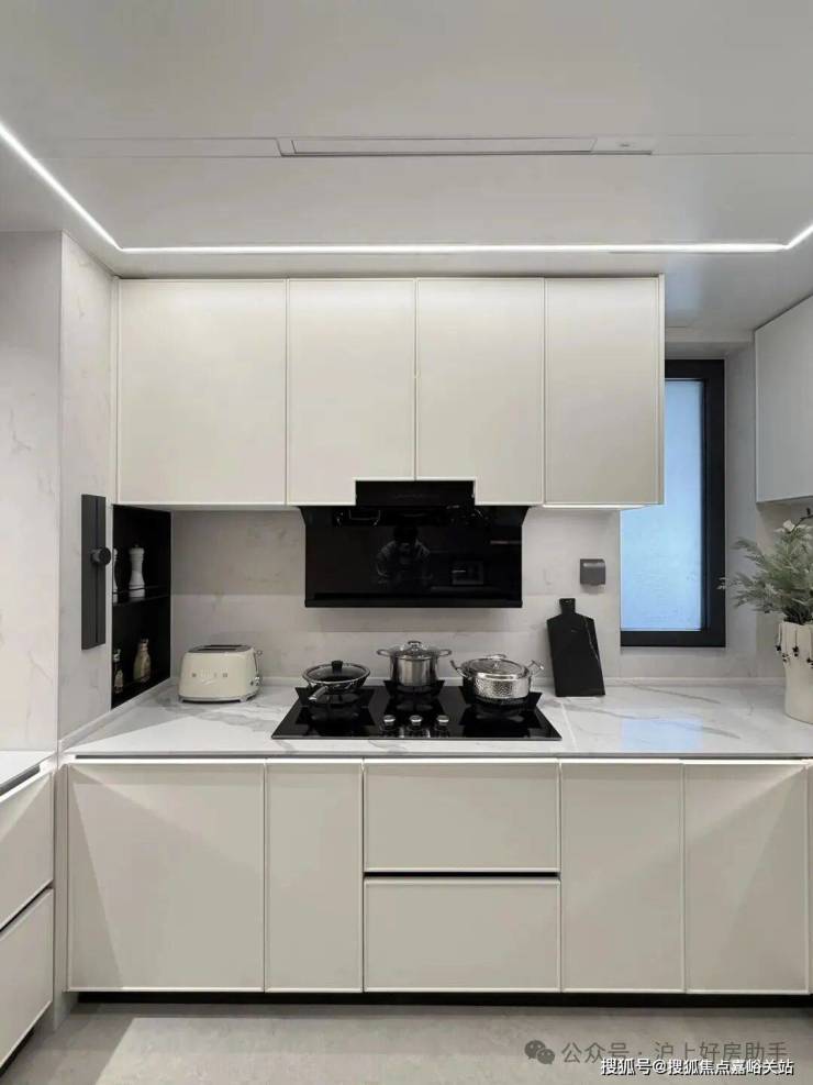 进门可以看到经典的S墙设计,L 海上清和玺售楼处电话:400-8894-986型厨房操作台面,也是暗藏不少细节——玻璃移门采用完美系列夹丝玻璃+金属造型边框,顶部配置线性凉霸+LED嵌入式回形灯带+筒灯,灶台后侧采用大面积岩板铺设,方便清洁的同时显得厨房更加大气。