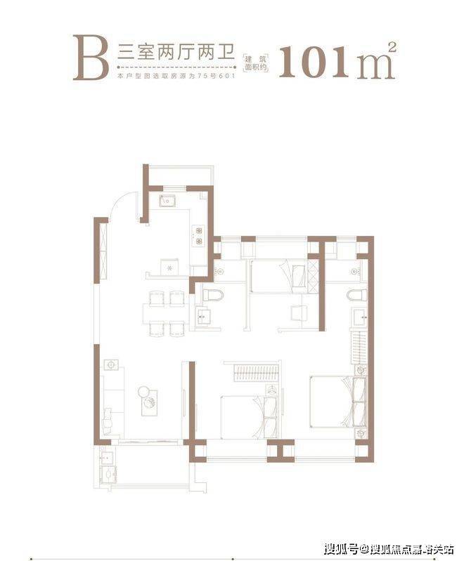 1、约101㎡均为3房2厅2卫,A、B户型分别是边套、中间套,满足不同人群的居住需求。