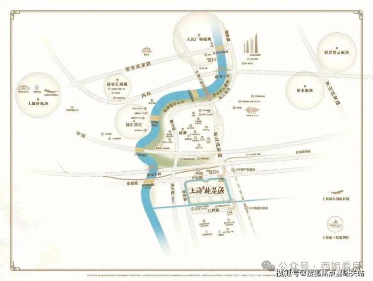「上海桃花源」位于黄浦江以东的闵行区浦锦街道,是前滩板块旁的 首席配套居住区。在济阳路高架开通后,开车快速可达前滩,还可以车行方便速达人民广场、南京西路、百年外滩、陆家嘴国金中心、淮海路IFC、新天地商圈、联洋碧云国际社区、徐家汇恒隆广场,可以说是 融合浦西浦东真正精华的地段!