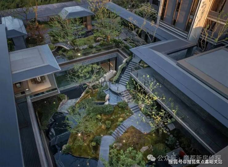 不同于传统围墙分隔,小高层与叠墅区之间,被一条中央景观绿轴温柔区隔——溪流蜿蜒、桥影点缀,水声与光影在绿意间悄然流淌。