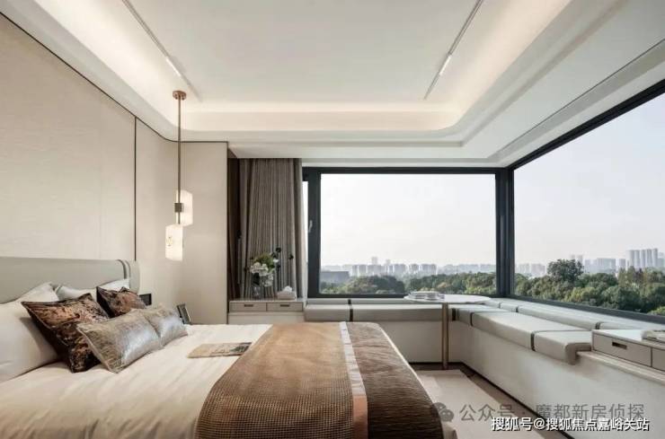 卧室同样颇具惊喜:边套户型配备约270°转角飘窗,推窗而见皆是景色;主卧不仅自带独立卫浴,还预留衣帽空间,能够同时满足男女主人的双衣柜需求,心爱的西装、手袋、礼裙都有了专属的陈列场。