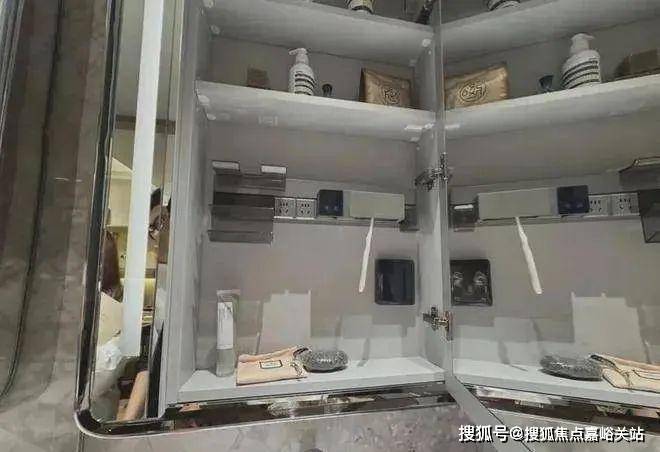 卫生间镜柜有个小小的亮点就是采用了镀铬镜柜边框,主卧镜柜有美妆冰箱,柜体也是通长的,收纳比较足。