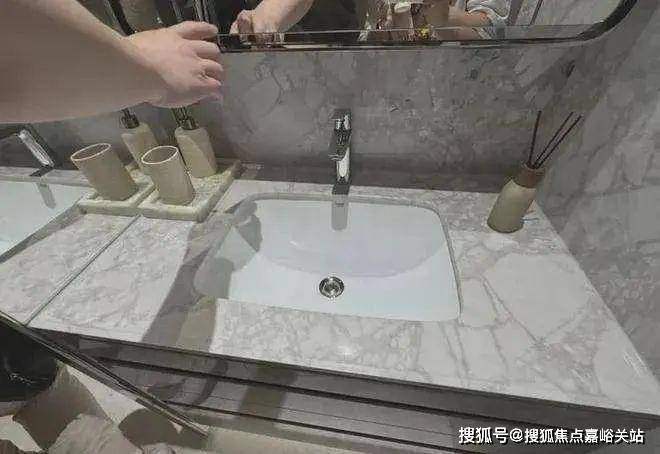 和华润宝山项目不太一样的是,时代之城也有很多采用奢石奢玉的地方,不过花纹不会有太浓烈的海派风格。玄关柜背板用的是白雪公主奢玉,大理石台面、高仪台盆+龙头,还帮你们做好了挡水沿。